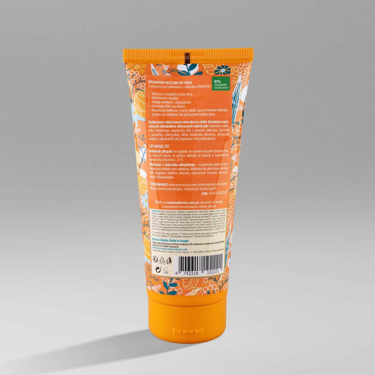 Nowa, certyfikowana formuła oparta na hydrolacie z rokitnika. Wegańskie mleczko do ciała łatwo się wchłania, pozostawiając skórę gładką, miękką i elastyczną. Witaminy A i E zawarte w organicznym oleju z rokitnika ałtajskiego, marokańskiego oleju arganowego, olejku makadamia i ekstraktu z jarzębiny syberyjskiej odżywiają i nawilżają skórę. Dzika miodunka plamista i arktyczna malina stymulują działanie naprawcze skóry oraz chroniąc ją przed negatywnym wpływem środowiska.